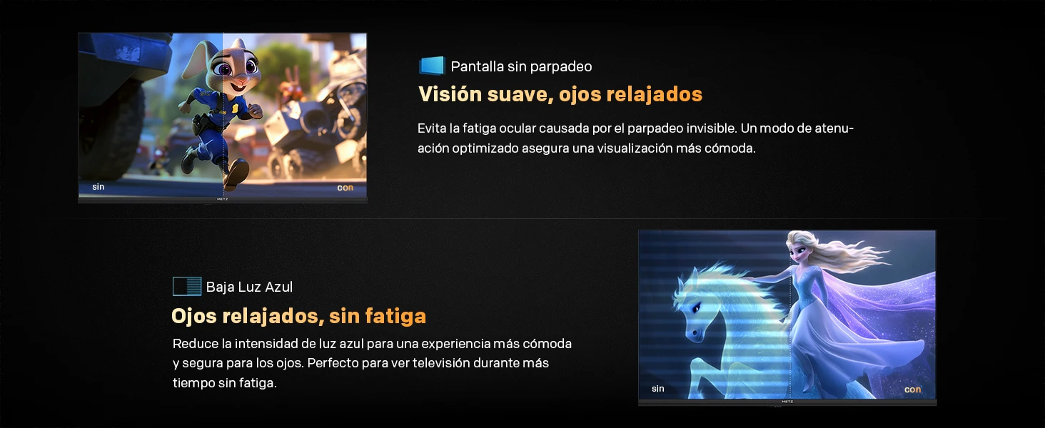 Technologie Eye-Care : Protection de la vue grâce à un écran sans scintillement et à faible lumière bleue pour réduire la fatigue oculaire lors de longues sessions de visionnage ou de jeu