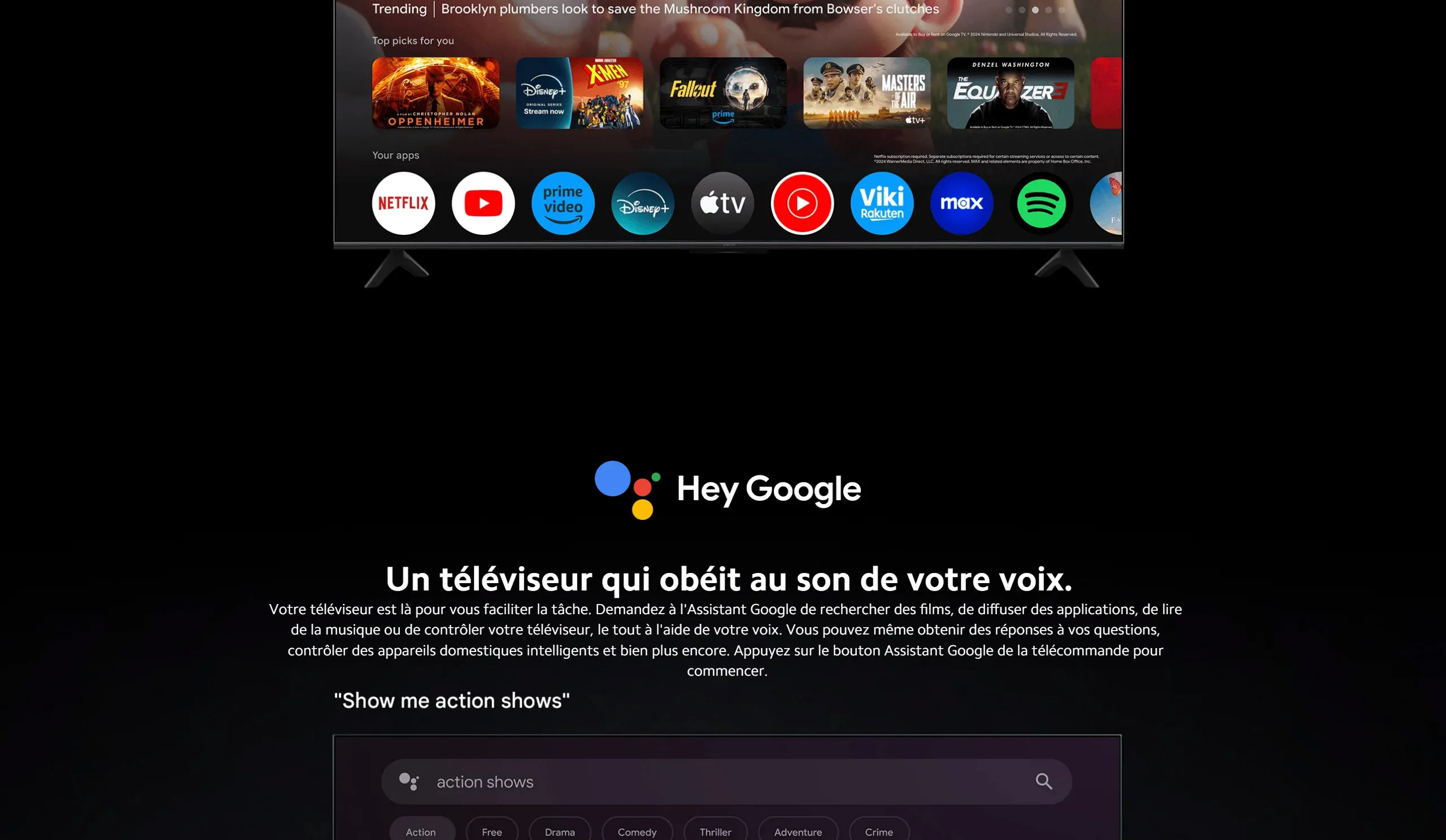 La TV fonctionne avec Android TV, offrant une interface fluide et intuitive, ainsi qu'un accès à toutes vos applications favorites via le Google Play Store. -